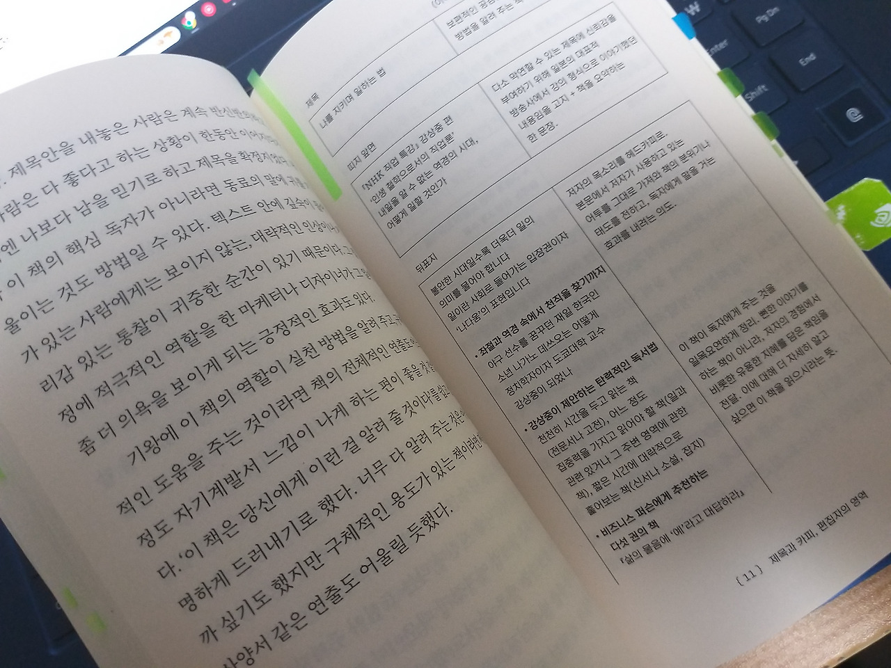 본문은 사무실에서 원고와 씨름하는 일, 이를테면 교정 교열이나 내부 디자이너와 소통하는 업무부터 서점 매대를 살피고 알맞은 자리를 기획하는 등 사무실 바깥에서 더 큰 시각으로 구성요소를 하나씩 채우며 완성도를 높이는 일까지 넓은 업무 범위를 포괄하도록 구성되었다. 그래서 편집 매뉴얼로 기획된 기존의 편집실용서와 다르게 『문학책 만드는 법』을 포함한 ‘공부책 시리즈’는 편집자의 일상과 밀접한 내용을 엿볼 수 있기도 하다. 특히 4부 중 「내 머릿속 클라우드」에서는 기획 아이디어를 포착하는 방법을 설명하는 데 저자의 실제 루틴이 예로 사용된 것이 돋보인다. 문학서를 향한 애정이랄까 분투랄까. 하여튼 이 많은 걸 다 보려면... 눈 건강을 평소에 챙겨두어야겠다.