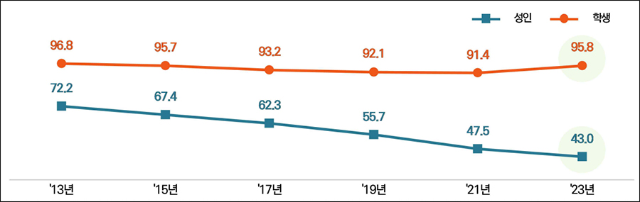 문화체육관광부에서 발표한 자료에 따르면 지난해 성인 독서율은 4.5%p가량 떨어졌다. 성인 10명 가운데 약 6명이 1년에 책 한 권 읽지 않는다. 반면 최근 젊은 세대가 독서를 향해 보이는 높은 관심은 놀랍다. 같은 자료에 따르면 10대 청소년의 종합 독서율은 95.8%로 종이책과 전자책 모두 이전에 비해 고르게 증가했다. 성인의 종합 독서율이 10년간 추락하는 반면 10대 청소년의 종합 독서율은 지난해를 기점으로 해 상승세로 전환되었다.