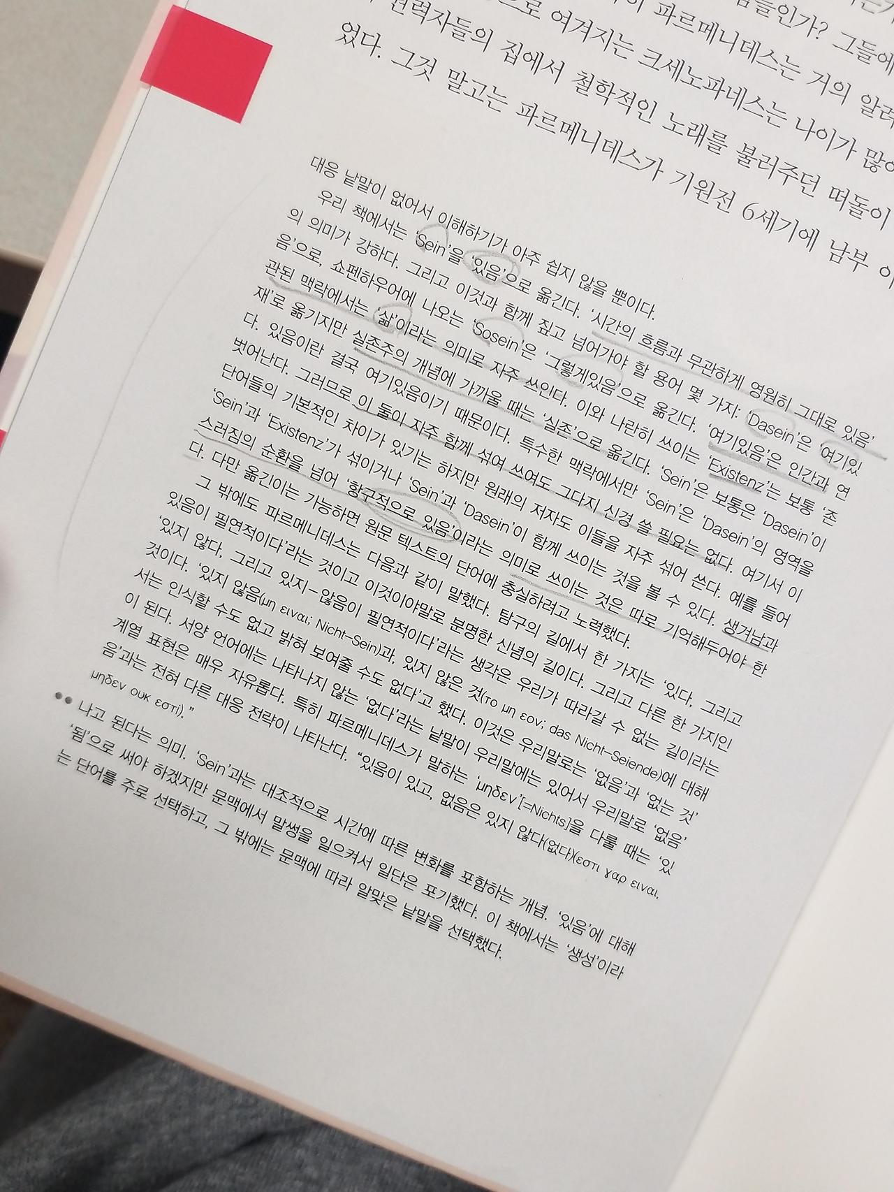 다음은 조금 논쟁이 될 만한 부분이기도 합니다. 『철학의 뒷계단』은 난해하고 복잡하게 느껴지는 기존의 철학 용어 일부를 맥락에 맞게 수정하였습니다. 한마디로 과감하게 의역한 것입니다. 역자(혹은 편집자)는 ‘아울러 그간 철학계에서 일반적으로 사용해 온 용어 일부를 우리말 낱말로 바꾸어 번역했다.’고 일러두었습니다. 가령 ‘존재’는 ‘있음’으로 ‘진리’는 ‘참’으로, ‘존재자’는 ‘있는것’으로 ‘현존’을 ‘여기있음’으로 대체해 표기하는 식입니다. 니체를 다루는 데 핵심이 되는 단어인 ‘니힐리즘’ 내지 ‘허무주의’를 역자는 ‘아무것도아니즘’으로 번역했습니다. 니힐리즘이나 허무주의는 우리에게 나름 익숙한 단어인데도 말입니다. 역자는 일관성 있게 ‘니힐리스트’는 ‘아무것도아니스트’, ‘초인’을 ‘인간너머’, ‘nichts(보통 허무라고 번역되는)’를 ‘아무것도 안’으로 옮겼습니다. 물론 그 때문에 조금은 어색한 문장이 만들어지기도 했습니다. ‘우리는 끝없는 아무것도안을 통과하며 방황하고 있는 것 아닌가?(484쪽)’. 다소 과감하게 의역했음에도 저는 『철학의 뒷계단』이 ‘철학 입문서’인 만큼 일반 독자가 이해하는 데 어려움이 없어야 하므로 오히려 직역보다 낫다고 생각했습니다. 우리는 앞계단이 아닌 뒷계단을 이용하고 있으니까요. 위 사진처럼 역자는 다소 어색하게 느껴지는 의역에는 주석을 다는 등 원어의 의미를 쉽게 전달하기 위해 다방면으로 애썼습니다.