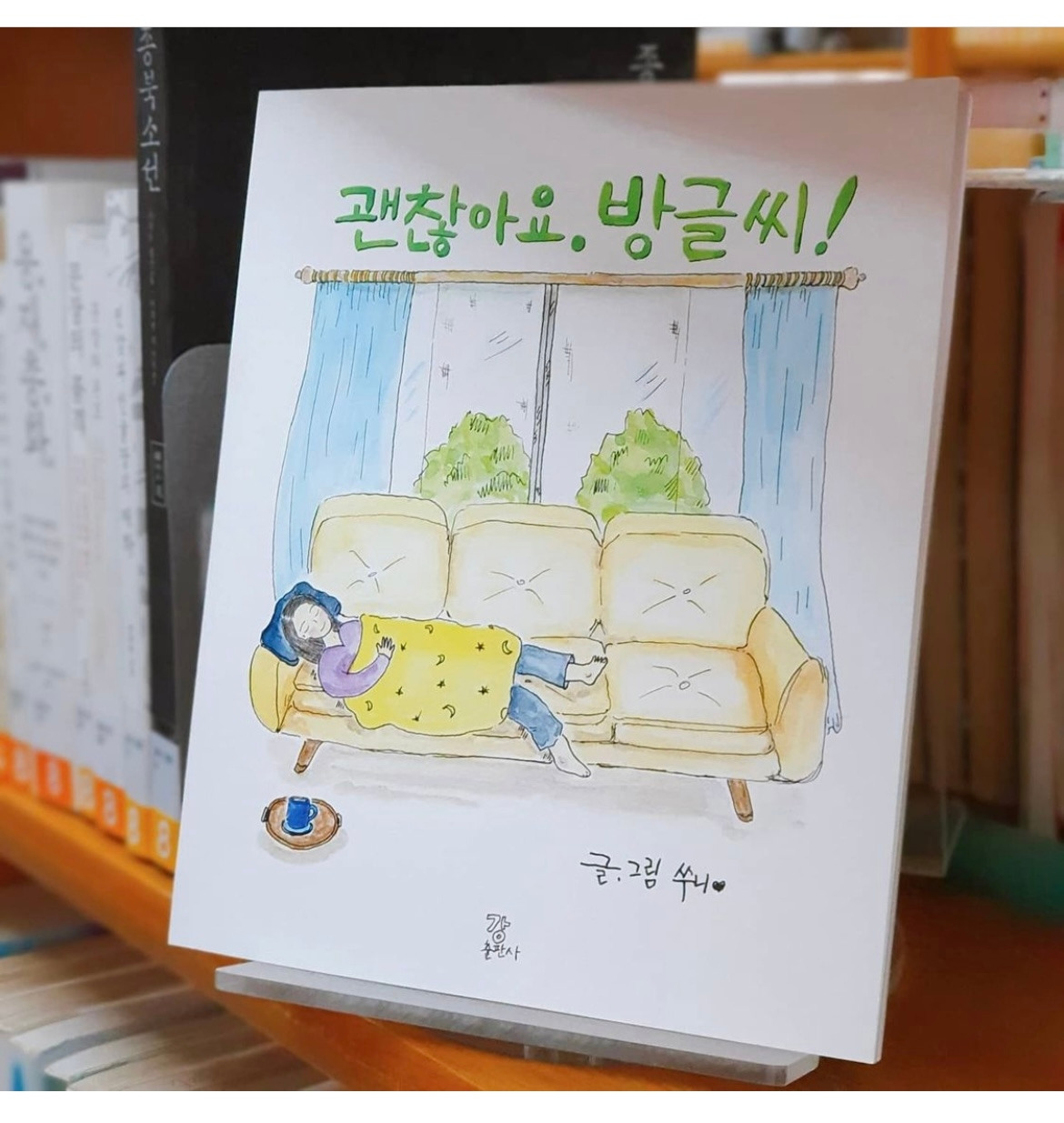 상상하는 것도 평소 연습이 되지 않은 탓에 어려웠다. 이런 것이 창작의 고통인가? (BTS의 노래‘디오니소스’라도 들으며 논알콜 맥주라도 마셔봐야 하나?) 첫 번째는 책 자체가 목표였지만 두 번째는 스스로 많은 걸 요구하고 있었다. 생각을 깊이 하면 할수록 욕심이 끝을 모르고 치 닫았다. 그럴수록 두 번째 책은 멀어져만 가는 것 같았다. 결국 욕심이란 놈을 억지로 떼어버렸다. 주변에서 찾아보자. 내 이야기를 해 보자. 쉽게 접근해보자. 일상 속 소박한 행복을 찾으며 무채색에서 다채로운 색으로 피어나는 주인공 방글씨, 방글씨로 변신한 나의 이야기 <괜찮아요. 방글씨!> 가 탄생했다.