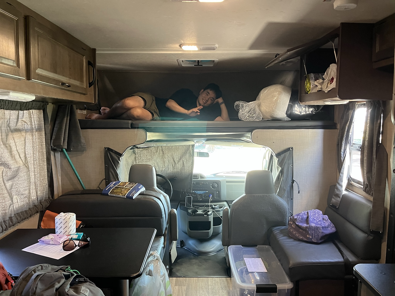 하나는 평범한 캠핑카 침대 영역이고 다른 하나는 운전석 위에 매트리스 펼쳐서 자는 침대. 여기가 에어컨 바람이 더 잘 들고 양쪽으로 작은 창문도 있어서 남편이 쓰기로 했다. 우리는 두 명뿐이라 침대 하나씩 차지하고 대자로 뻗어 편하게 잤다.
