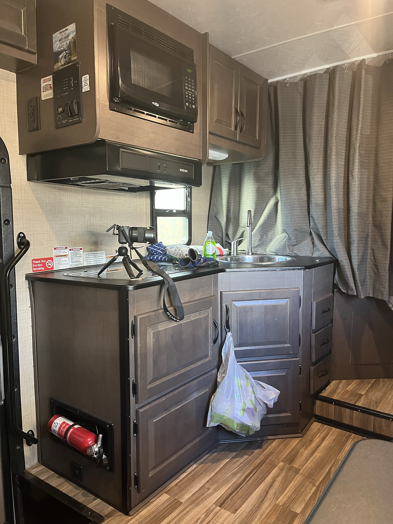가스를 쓰는 화구 3개, 전자레인지, 냉장고, 개수대까지 딱 필요한 시설들만 있다. 화구는 한 번에 2개 이상 돌리기는 어렵고 환풍이 썩 잘 되진 않아서 연기 많이 나는 요리를 하면 화재경보기가 엄청 울린다. 그리고 차가 움직일 때 가스레인지 위쪽 유리 덮개도 들썩들썩 시끄러워서 수건을 한 장 끼워놓고 다녔다.
