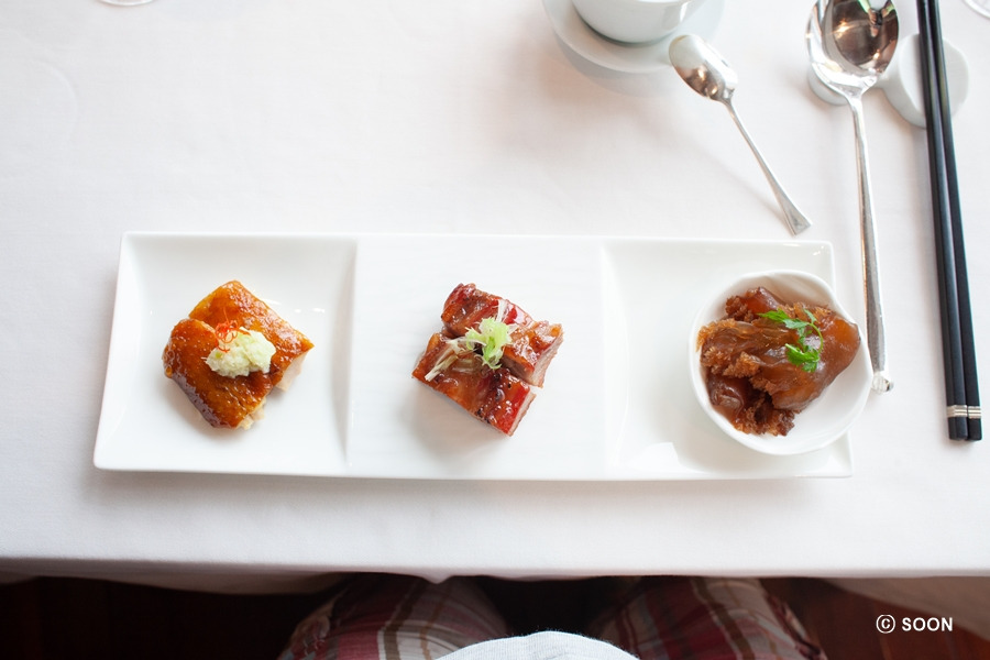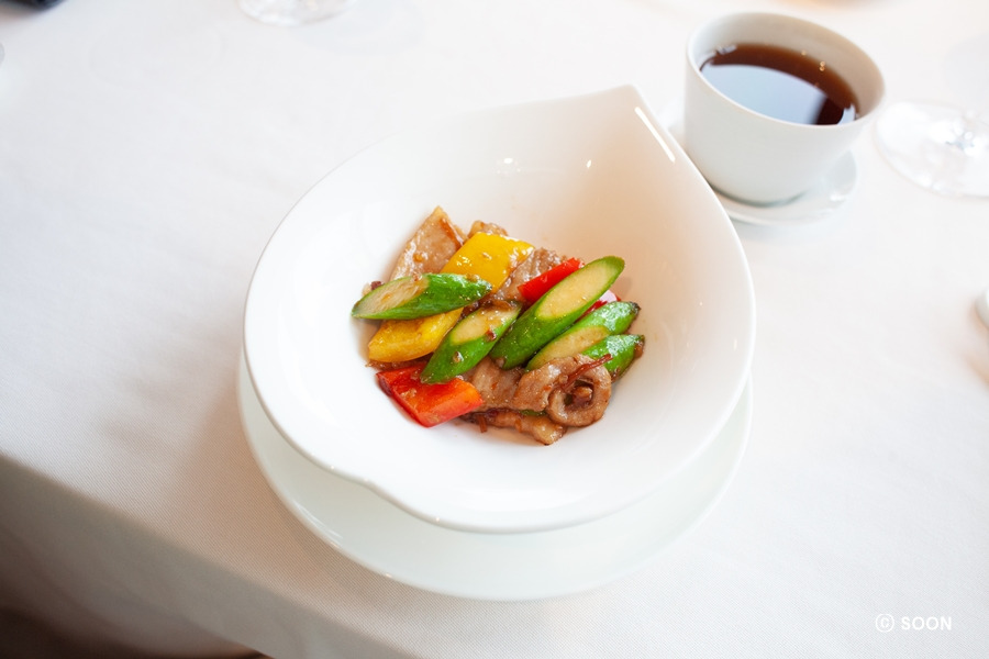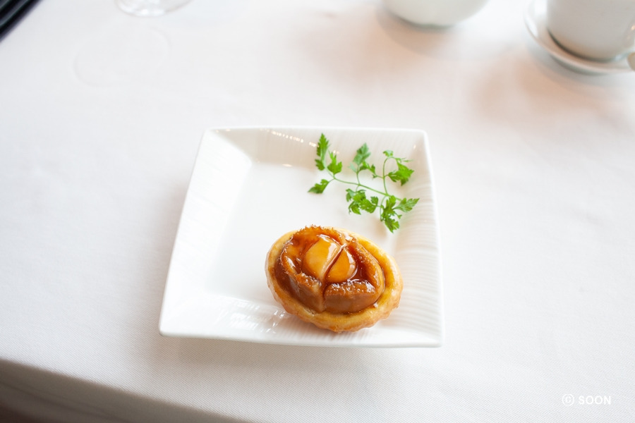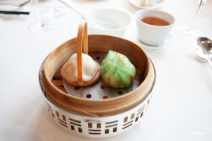 첫 번째 메뉴는 딤섬이었다. 우리에게 친숙한 샤오롱 바오와 크랩이 들어간 딤섬 위에 금종이가 올려져서 나왔다. 둘 다 너무 맛있었는데, 개인적으로 나는 크랩이 들어간 딤섬이 식감이 훨씬 아삭하고 맛이 좋았다. 딤섬은 너무너무 훌륭했다.