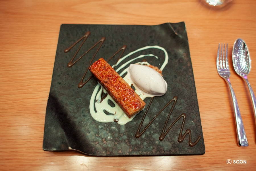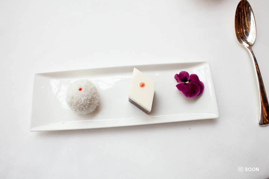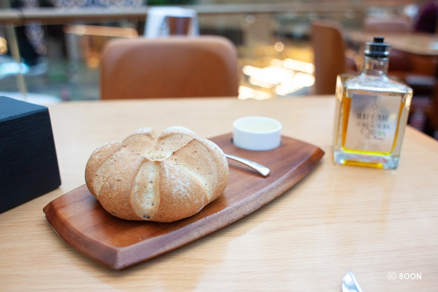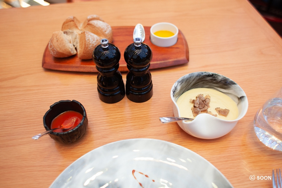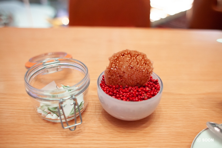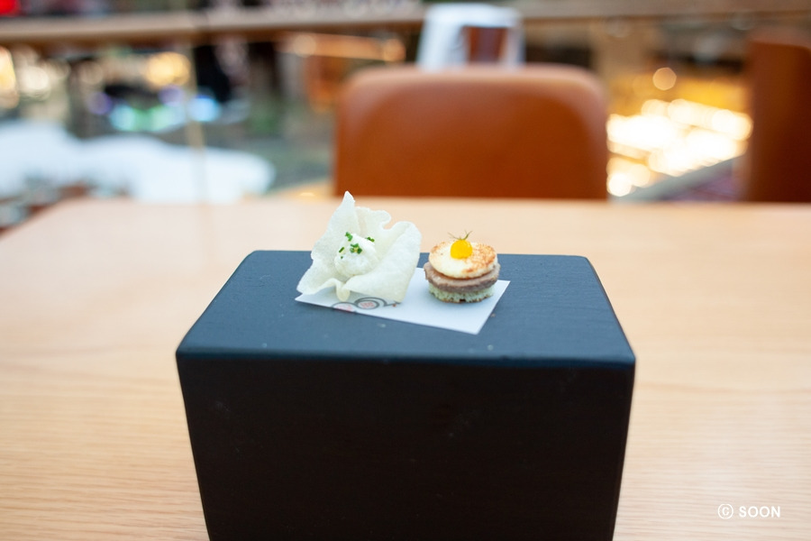 그래도 한번 타봤다는 것에 만족하고 잘 돌아와서 사진이랑 영상 정리하고 조금 쉬었다가 6시 반에 맞춰서 저녁 먹으러 ㄱㄱ 6시 반에 예약한 사람이라고 이야기하니 바로 자리를 안내해주었고, 역시 이번에도 코스요리였다. 다행히 3코스였고, 부담 없이 먹을 수 있겠구나 생각했던 게 내 착각이었다! 일단 처음에 웰컴 스낵 2개가 나왔고, 이건 양이 작아서 그리고 아주 맛있어서 먹었고, 식전 빵이 나왔는데 맛있었는데 조금만 먹었다!