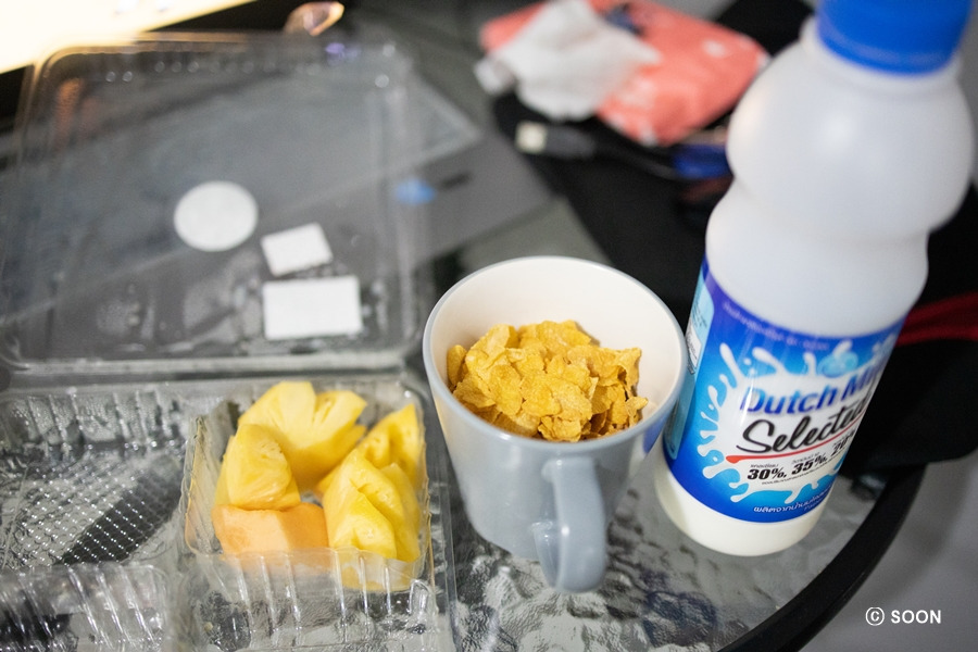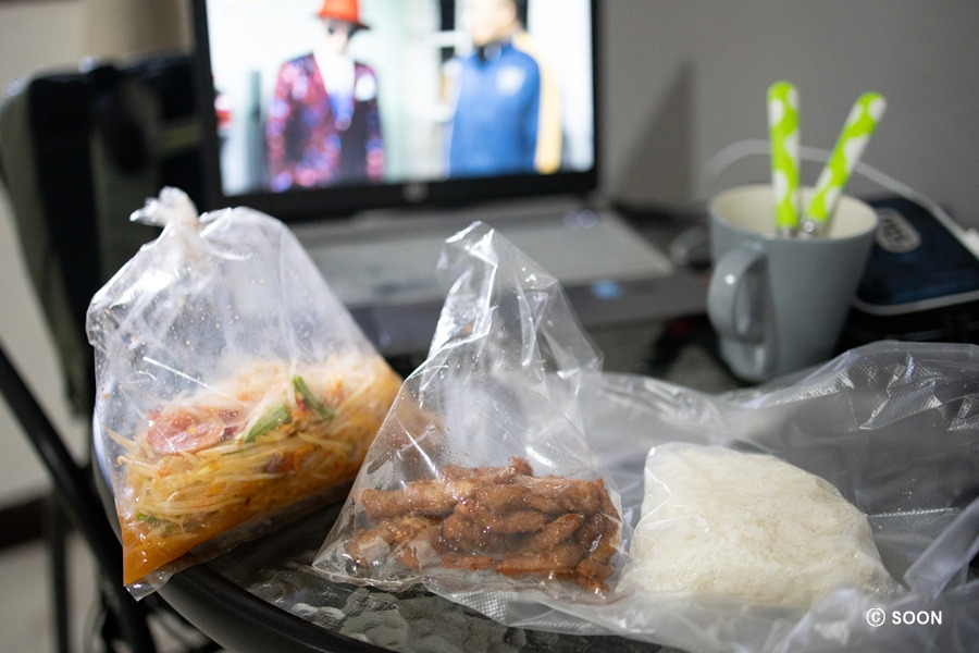 다행히 청소는 마쳐있어서 너무 좋았다. 오후에 청소를 하신다고 했는데 금방 하셨나 보다 ㅎㅎ 깔끔한 방을 보니 또 기분 업! 맥주 냉장고에 킵 해두고, 사진 정리하고 쉬었다. 청소하면 휴지도 새로 주는 줄 알았는데, 처음 체크인할 때만 휴지 한롤과 샴푸, 비누만 주고 그다음부터는 내가 사야 하나보다 ㅎㅎ 그래서 갓 쑤언깨우 20바트 샵 가서 휴지 사고, 밖에 푸드 마켓이 평소 때는 5시쯤 여는데 4시 안된 것 같은데 열어서 쏨땀이랑 돼지고기 구이랑 찰밥이랑 사서 숙소로 돌아왔다.