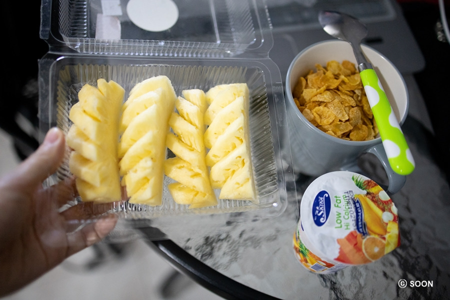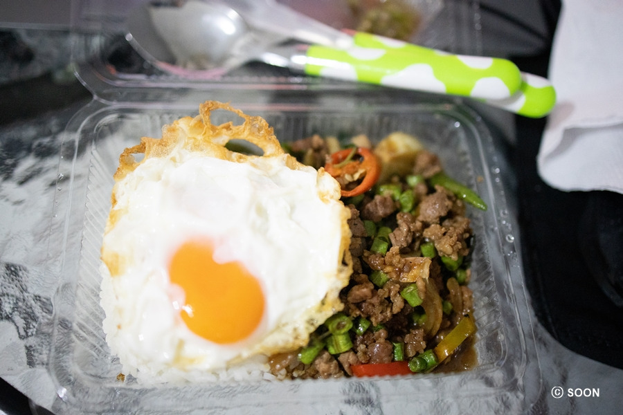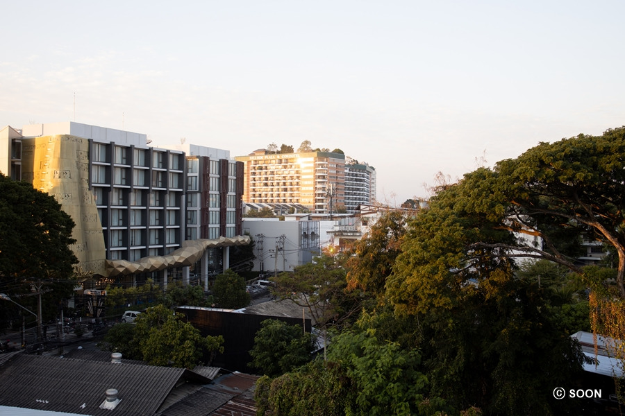 고맙다고 답변을 보내고, 드디어 풍등 행사를 볼 수 있다는 기대감으로 아점을 먹었다. 예능 하나를 보고 쉬다가 5시쯤 저녁거리를 사러 님만 쪽으로 갔다. 그랩 푸드를 시켜 먹을까 했는데, 쿠폰이 말일까지라 내일로 미루고 슬슬 산책 겸 님만 쪽 저렴한 로컬 푸드 있으면 사 먹을까 했는데, 문 닫은 곳이 많아서 결국 미얀마 타이 식당까지 가서 바질 돼지고기 볶음 포장해서 숙소로 컴백~ 일몰 시간 맞춰서 발코니로 나가서 오늘도 라떼 한잔 마시면서 사진 찍고 여유를 즐겼다.