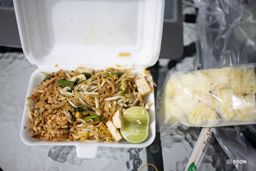컨디션 좋으면 토요 마켓을 보려 했으나 두개의 마켓 아니 센트럴까지 합치면 세개의 마켓이라 너무 피곤해서 숙소 가거나 마사지받는다고 해서 그냥 님만으로 돌아왔다. 아쉽지만 헤어지고 나는 들어오는 길에 팟타이 꿍이랑 파인애플 포장해서 숙소 와서 씻고, 저녁으로 맛있게 먹고 사진 정리하고 예능 보다가 잘 잤다.
