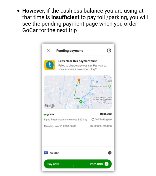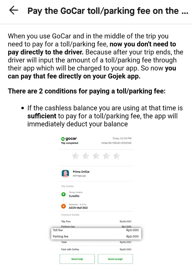 그리고 공항 갈 때 고젝에 5천 루피아 공항 톨비라고 해야 하나? 입장료 같은 거 포함인데, 기사 아저씨가 돈을 1만 루피아인가 더 달라고 해서 줬고, 내리고 나서 후기에다가 글 남겼더니 더 주는 거 아니라고 답변받았어요. 그래서 고젝 고객센터에서 다시 한번 메시지 와서 얼마 더 냈냐라고 해서 1만 루피아 더 주었다고 했더니 확인해보고 연락 준다고 메시지 왔는데, 이미 저는 한국 들어온 상태라서 어쩔 수 없지만, 고젝 예약할 때 영수증 보시면 그리고 특정 장소로 가는 거면 Toll fee / Parking fee 이런 식으로 청구가 된다고 나옵니다. 그래서 혹시 고카 운전사가 공항 톨비 달라고 하면, 청구되었다는 고카 앱에서 영수증 보여주시면 됩니다. 참고로 클룩에서 차량 일일 투어시에는 아마도 현금으로 주셔야 할 겁니다. 이건 포함이 아니라서...