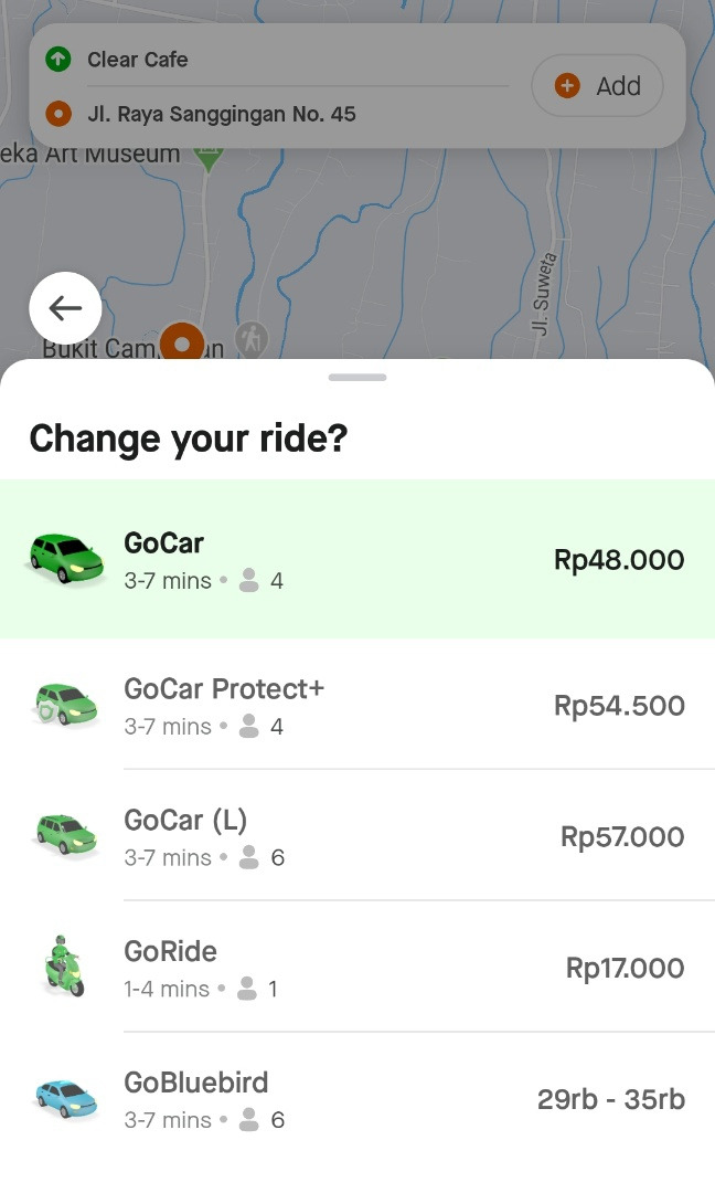 일단 저는 안드로이드 폰이라서 안드로이드로 2개의 앱을 다운로드 받았습니다. 그 이유는 둘 중 저렴한 게 있어서 둘 다 이용하려고 했는데, 장거리는 고젝이 더 저렴했고, 단거리는 마이블루버드가 더 저렴했습니다. 고젝에서 고카로 검색하면 블루버드 가격도 나옵니다. 그래서 아마 블루버드가 저렴하다고 나오니까 블루버드 앱 까신분들도 있으실 겁니다. 3km 미만은 블루버드가 더 저렴했던 것 같아요. 블루버드의 경우 기본요금이 3만 루피아인데, 고젝은 차 막히면 비싸게 나와서 2km 미만이라도 우붓 시내 같은 경우엔 45000루피아 나오고 그러더라고요. 그래서 그럴 때는 블루버드 이용하고 그랬습니다. 고젝이 조금 더 빨리 잡히는 건 있는데, 블루버드도 안 잡히는 건 아니라서 조금 여유롭게 시간 잡고 잡으면 우붓 시내에서는 잘 잡혔어요. 그리고 장거리는 확실히 고젝이 더 저렴했습니다.