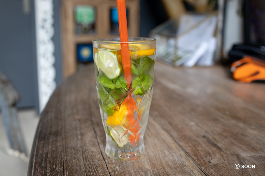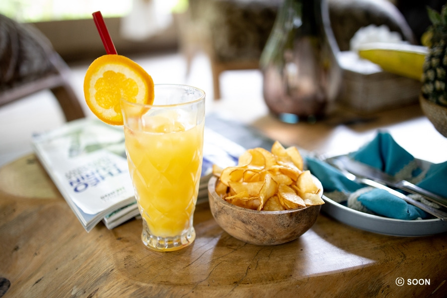 리셉션의 화이트와 나무의 조화가 너무 좋았다. 분명 이곳의 오너는 감성캠핑을 좋아하는 사람이 아닐까? 생각이 들었다. 체크인할 때 분명히 음료를 줬는데, 리조트를 소개받고, 방으로 안내받았을 때 또 웰컴 드링크를 줬다. 그래서 너무 좋았다. 이런 친절한 서비스 Good~그리고 함께 준 고구마 칩도 너무 맛있었다.