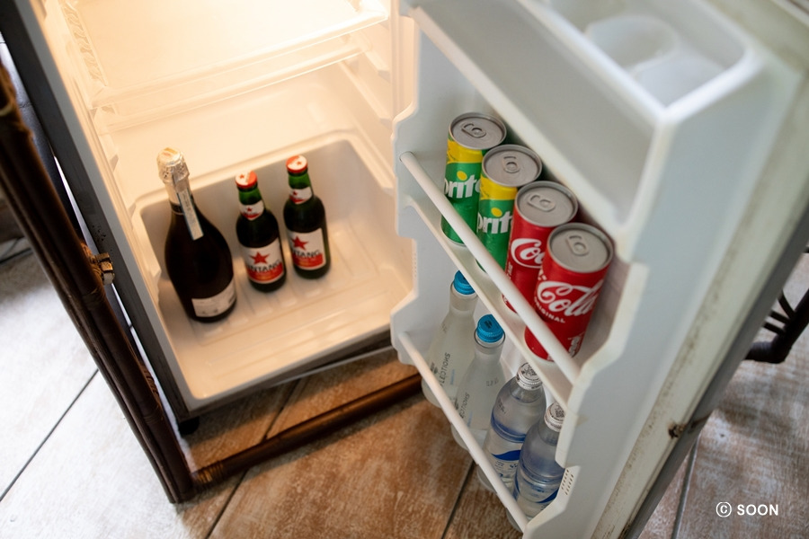 이곳에서 티는 레몬티도 있어서 나중에 마셔보고 그랬다. 커피도 카푸치노, 믹스커피가 있어서 달달 구리 커피 초록 논 뷰 보면서 마시고 그랬다. 냉장고에 생수 2병을 제외하고는 모두 유료