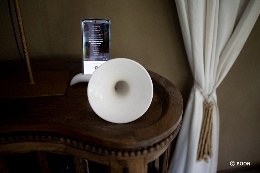 침대 옆 책상 옆에 무전력 나팔 모양 스피커가 있었는데 자연 친화적 컨셉과 너무 잘 어울렸고, 또 음악도 들을 수 있어서 너무 좋았다. 차 마시면서 음악 들을 때 너무너무 힐링타임^^