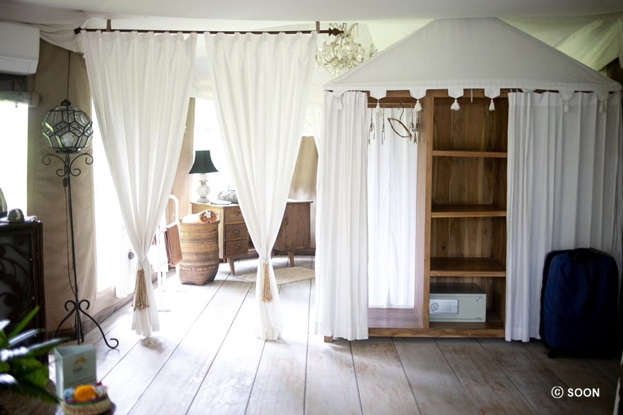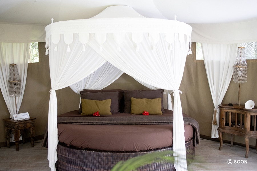 내가 배정받은 텐트는 스위트 텐트라서 그런지 침대가 동그랗게 생겼고, 스위트 텐트는 총 2개가 있다고 했다. 나머지 텐트는 킹 베드이고 텐트 구조는 같아서 로맨틱한 분위기 연출을 위한 것 아니면 일반 텐트가 두명 자기엔 더 편할 수 있겠다 싶었다.