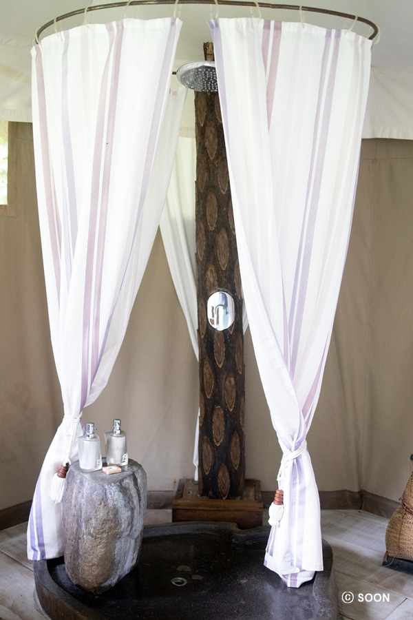 욕실은 오픈형이었는데, 텐트다 보니 비닐? 재질? 그리고 투명 비닐로 되어있는 부분이 밤에는 턴다운 때 커튼을 쳐 주는데, 이게 커튼이 없는 부분도 있어서 그 점은 조금 아쉬웠다.