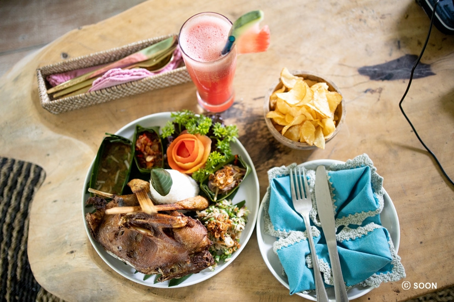 숙박권 외로 인도네시아 전통 점심식사 1회가 포함이라서 추천 메뉴 받아서 주문했는데, 아주 맛있게 잘 먹었다. 삼발 소스도 있고, 매콤 고추 소스도 있고, 마늘 소스도 있어서 밥이랑 오리고기 BBQ랑 소스 찍어서 같이 먹었는데 아주 맛있는 점심을 먹었다.
