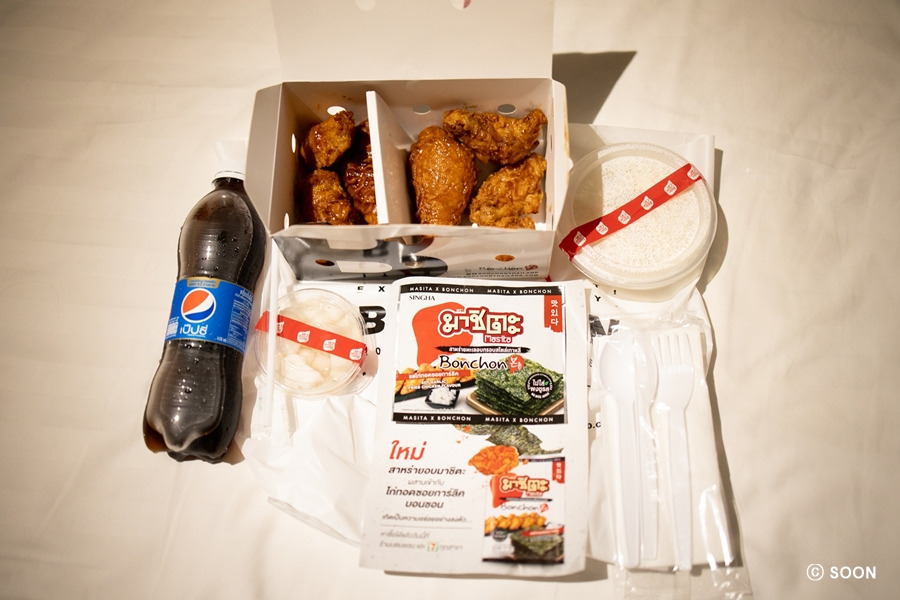 쉬다가 저녁 먹을 시간 다되어서 멀 먹을까 하다가 어제 놀면뭐하니에서 통닭을 튀기길래 치킨이 먹고 싶어서 치밥으로 결정했다. 얼마 전에 심카드를 바꾸면서 한국 심카드로는 푸드판다를 가입한 적이 없어서 태국 심카드 유효기간 만료 전에 초대를 해서 100밧 할인코드를 받았는데 알고 보니 이게 초대한 사람과 초대받은 사람 둘 다 100밧이 할인되는 코드였다. 그래서 태국 심카드로 가입한 이메일로 로그인해 보니 100밧 할인코드가 있길래 그걸로 저렴하게 치킨 세트를 시켰다. 세븐일레븐 가서 500ml 콜라는 하나 사가지고 와서 치킨 배달 잘 받아서 예능 보면서 간장 양념반 매콤 양념반 치킨을 밥과 무와 함께 맛있게 먹었는데 간장 양념은 조금 많이 짜서 밥이랑 같이 먹어야 했고, 매콤한 양념이 생각보다 너무 매워서 나중에는 매운 껍질 부분은 다 떼어내고 먹었다. 치킨에 밥까지 먹으니 배가 너무 불렀다. 콜라는 반 이상 남아서 버렸다.