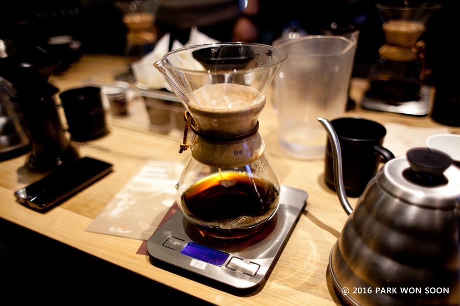 남자 바리스타 두 분이 시다모 원두와 폴바셋 전용 시그니처 원두 두 종류로 케멕스를 이용해 추출해서 맛보고, 우리는 오늘 폴바셋 시그니처 원두로 2가지 방식으로 추출했다. 두 커피 맛의 차이를 느낀 후 우리가 직접 내려서 바리스타분들이 내려줬던 맛들 과 비교해보고 서로 각자 추출한 커피들도 나눠 마셨다. 케맥스로 내린 건 처음에 내려서 그런지 정성이 가득 담겨 있어서 맛있었는데… 에어로프레스는 내가 힘이 없어서 그런지 맛은 그닥이였다.