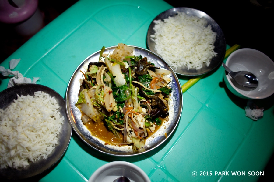 해가 거의 다 지고 우리는 택시 타고 숙소 와서 낮에 숙소 직원이 추천해준 미얀마 전통음식이라는 말라 커리를 먹기로 했다. 레스토랑을 추천해달라고 다시 말하자 바로 앞에 노점에서 판다며 데려다줬다.