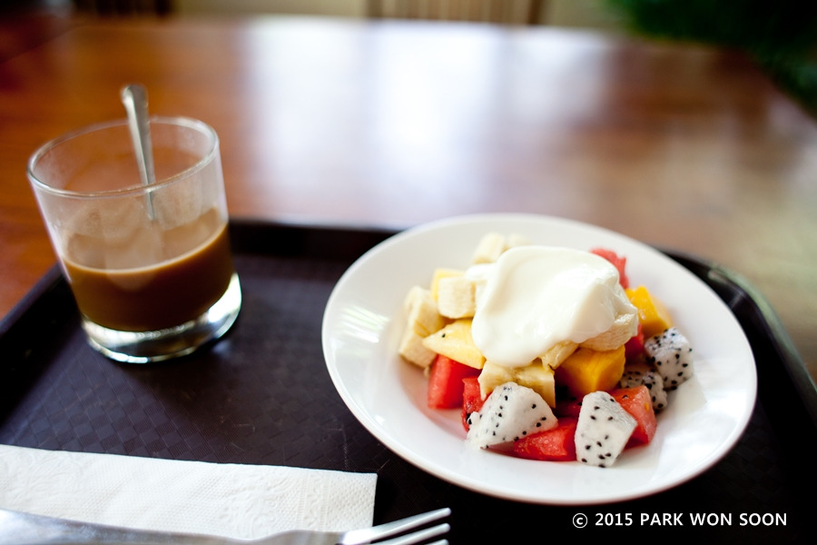 나트랑에서 둘째 날~ 7시 반에 알람 맞춰뒀는데 5시가 조금 넘어서 깨서 다시 잤다. 7시쯤 다시 일어나서 빈둥대다가 8시쯤 조식을 먹으러 갔다. 여러 종류가 있길래 과일에 요구르트 그리고 커피를 선택했다. 맛있게 잘 먹고 숙소 올라와서 안 더우면 포나가를 가려고 했지만 일단 일요일이라 베트남 애들 방학이라 달랏이건 나트랑이건 베트남 사람들이 너무 많아서 그냥 내일 가기로 하고 안 갔다. 사실 되게 더웠다 ㅋㅋ 그래서 숙소에서 빈둥대며 인터넷하고 놀았다. 조식이 부실했는지 11시쯤 배고파서 어제 먹은 쌀국수집에 또 갔다.