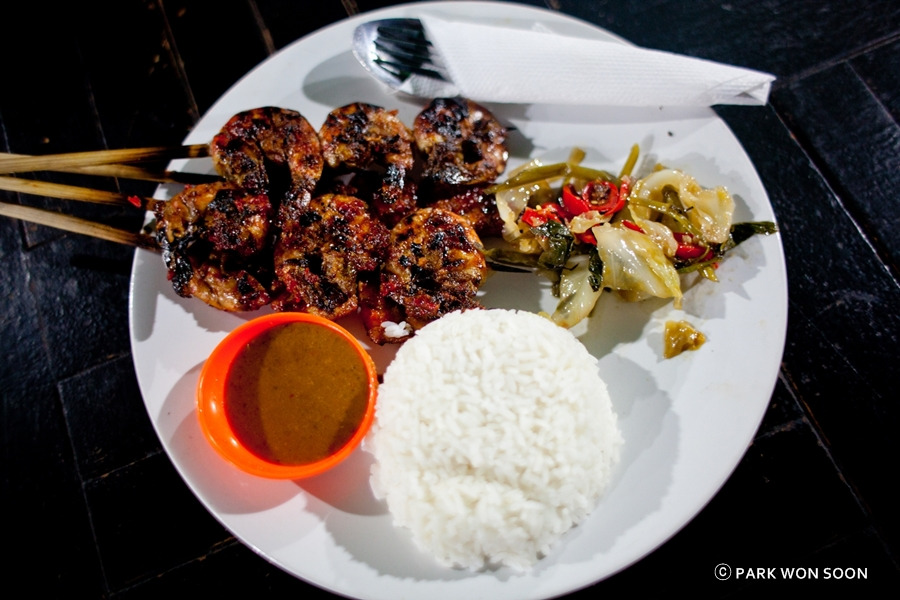 소규모로 밤마다 열리는 나이트마켓은 인도네시아 현지식과 BBQ 등이 있다. 섬답게 해산물들이 가득했다. 동영상을 열심히 찍고 있는데 누가 나한테 머라고 샬라 샬라 한다! 헐~ 어제 내가 일몰 보려고 갔던 곳에서 사진 찍어달라고 부탁했던 친구가 BBQ를 굽고 있었다 ㅎㅎ 나에게 아는 척을 하고 있었는데, 나는 영상 찍는라 정신이 없었던 거다 ㅎㅎ 이런 신기한 우연이 있나! 한 바퀴를 다 돌고 다시 그 친구 가게로 와서 치킨과 새우 BBQ를 시키고 기분이 업되서 빈땅 맥주를 한병 시켰다.