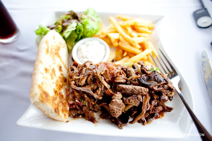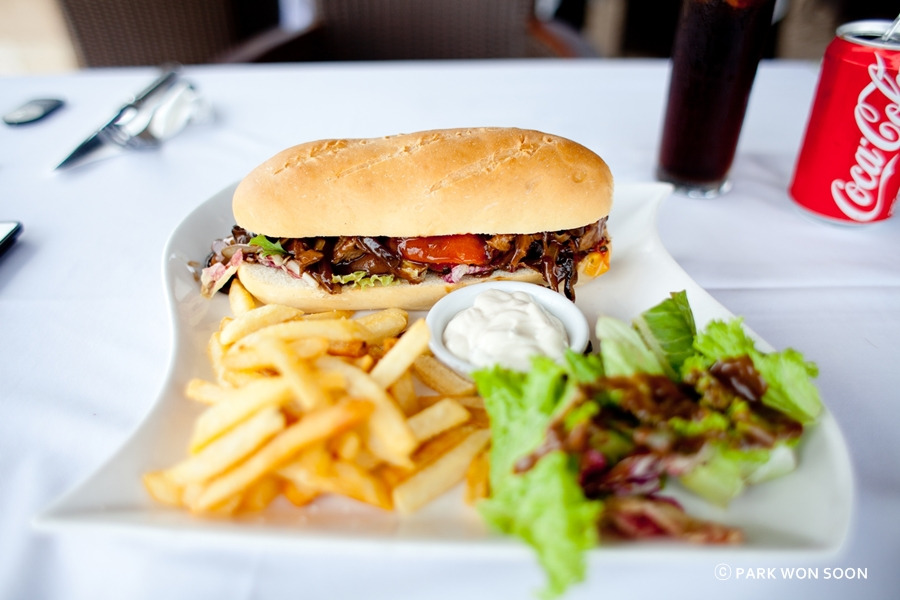 고급 레스토랑 치고 런치가 비싸지 않아서 일단 스테이크 샌드위치와 콜라 하나를 주문하고는 텍스 21%를 보고는 음 괜찮아 ㅎㅎ 하고 사진을 찍었다. 비 온 뒤이지만 날이 조금 흐려서 혹시 몰라 바다 바로 앞 말고 안쪽에 자리를 잡고 앉았다. 처음엔 점심시간이 훌쩍 지나서 나밖에 손님이 없더니 3시쯤 되니 하나둘 손님이 찼다.