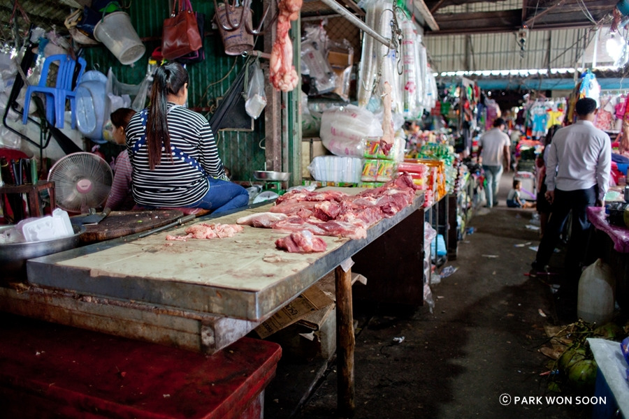 피자가게에 햄버거도 같이 팔고 있어서, 새우버거 하나랑 콜라를 시켰다. 생각보다 패티가 얇았지만 머 나름 맛있게 먹고, 배가 부르니 또 힘이 나서 시장으로 향했다. 첫날 잠시 보았던 시장 안쪽에 들어가 보았다. 느낌은 씨엠립 쌀르 느낌이랑 거의 같았다. 금은방도 있고, 야채가게, 과일가게, 중간에 식당도 있고 ㅋㅋ 잘 보고 냄새 때문에 금방 나왔다 ㅎㅎ