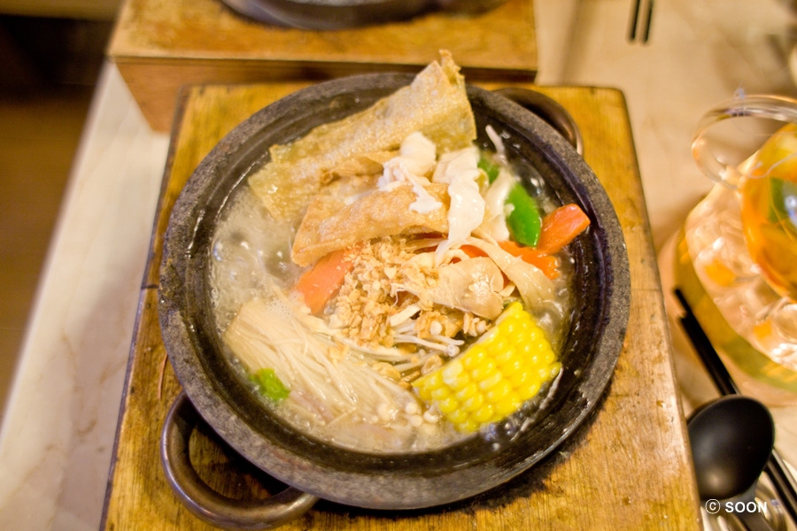 다행히 모노레일은 7 정거장 밖에 안 해서 금방 도착했고, 언니가 차가 조금 막힐 것 같다고 해서, 휴대폰 충전 케이블이 고장 나서 가는 길에 쇼핑몰이 있길래 들어가서 구경하고 있는데, 언니가 생각보다 일찍 도착했다고 톡이 와서 결국 못 사고 바로 국숫집으로 ㄱㄱ 다행히 주문해 놓고 있어서 도착해서 금방 바로 건강국수를 먹을 수 있었다. 구글맵에 보니 체인점인데 평이 참 좋았었다. 이곳은 사우나 누들이라는 걸 파는데, 우리나라로 치면 돌솥 쌀국수이다. 근데 흑미로 만들어서 메밀국수 같기도 하고, 안에 야채랑 버섯이랑 고기랑 등등 야무지게 많이 들어가 있어서 뜨겁긴 한데 엄청 맛있었다.