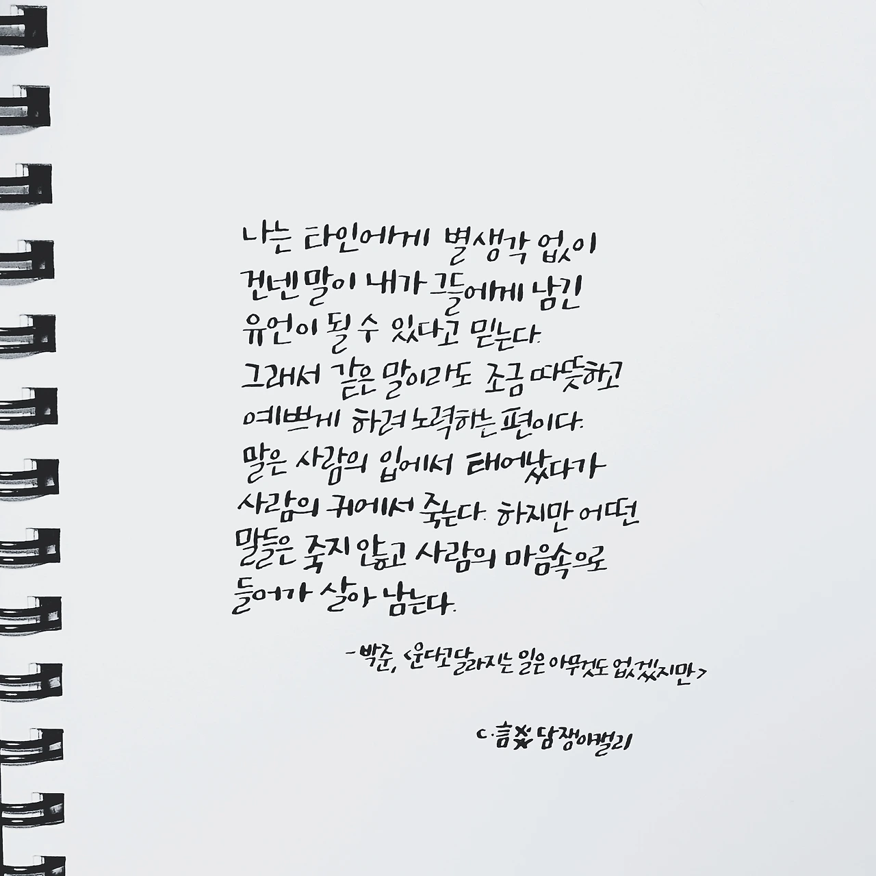 말보다 더한 고통을 주고도 자기들은 아무 말하지 않았다며 시치미 떼고 앉아 점잖을 떠는 모습을 볼 때면 헛구역질이 나기도 했다. 어릴 적 무턱대고 동경하던 어른이 이런 모습이라면 기꺼이 철들지 않는 어린아이로 남겠노라고 다짐하던 때도 있었다. 직접적인 위해를 가하지 않았으므로 본인은 떳떳하다는 그 위선적인 모습을 본 뒤로 나의 시선은 줄곧 아래를 향했다. 말이 통하지 않는 사람들과는 시선을 맞추는 것이 불필요하다고 느꼈고 혹시 모를 내 무의식적인 시선이 다른 어떤 이의 삶을 함부로 베지는 않을까 하는 우려 때문이었다. 호불호는 확실해도 나 역시 서툰 사람이므로 시선을 아래로 두는 것으로 나는 남의 삶을 함부로 흘기는 사람이 아니라며 선을 그었다.