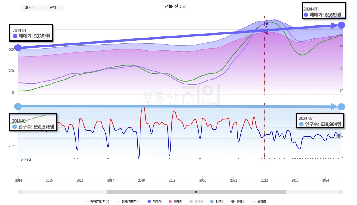 인구수 65만 명이었던 전주는 1.2만 명 줄었는데, 매매가격 50%나 올랐습니다.