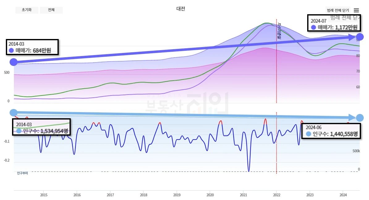 대전은요? 인구 10만 명 줄었는데 2배 올랐습니다. 광역시 제외라고요?? 메트로폴리탄이라서 제외라고요?