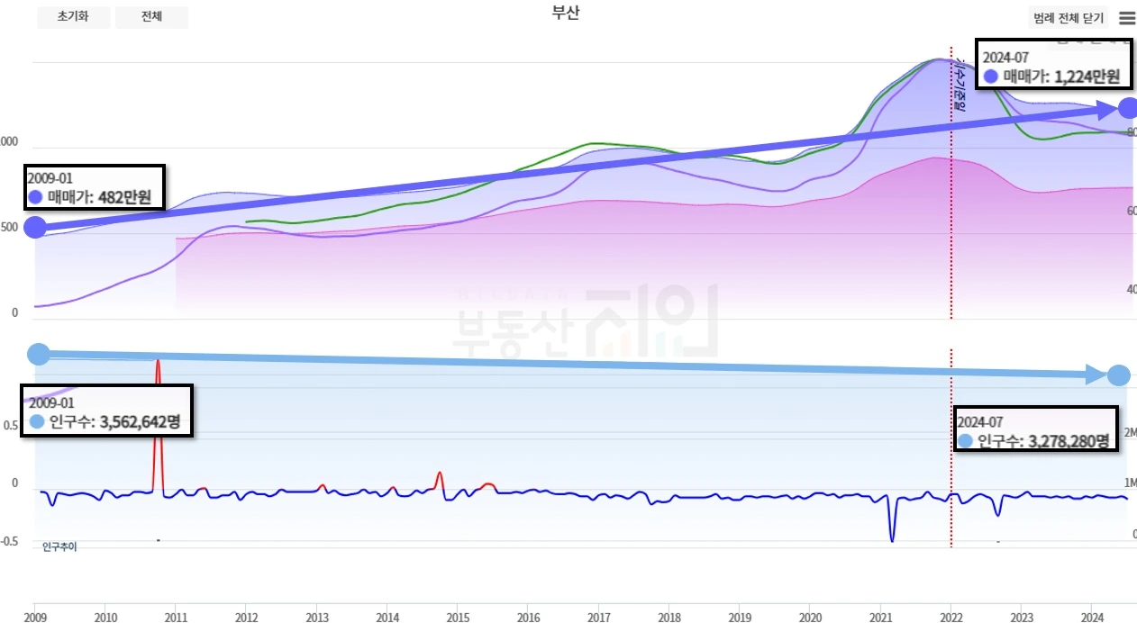 부산은요? 인구 20만 명 줄었는데 가격 얼마 올랐죠? 480에서 1200만 원으로 3배 올랐네요?