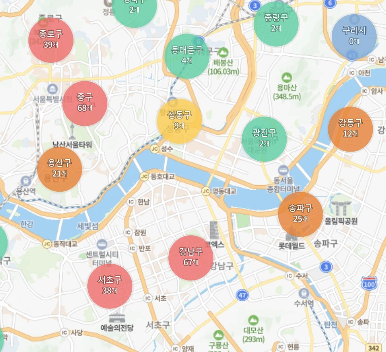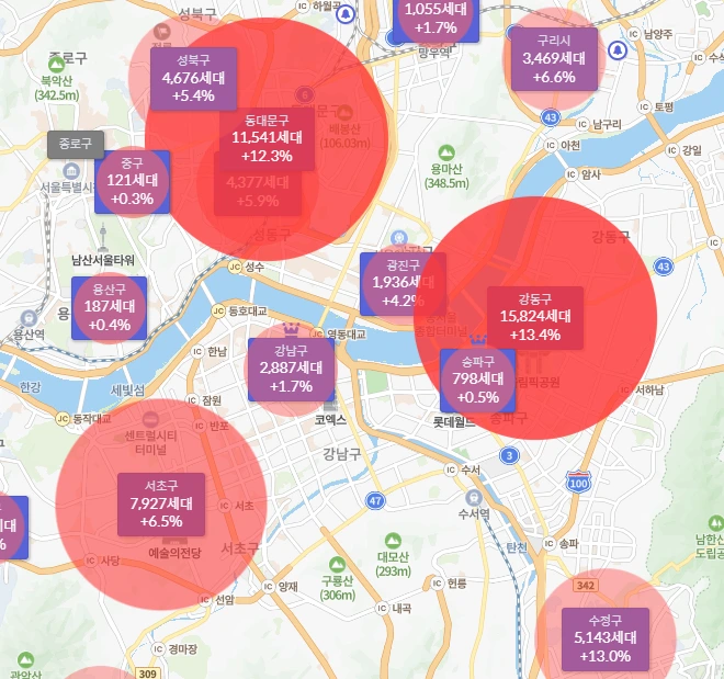광진구를 중심으로 빨간 원이 크게 삼각형으로 3곳이나 있네요