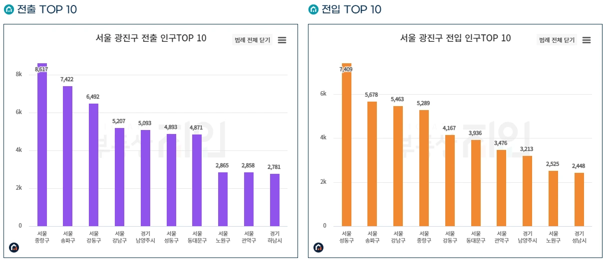 광진구는 서울 중랑구와 송파구, 강동구에 가장 많이 전출하는 지역임을 알 수 있습니다.