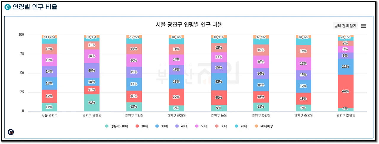 인구의 비율을 보면 광진구 자체에 50대까지 연령의 비율이 75%에 해당합니다.