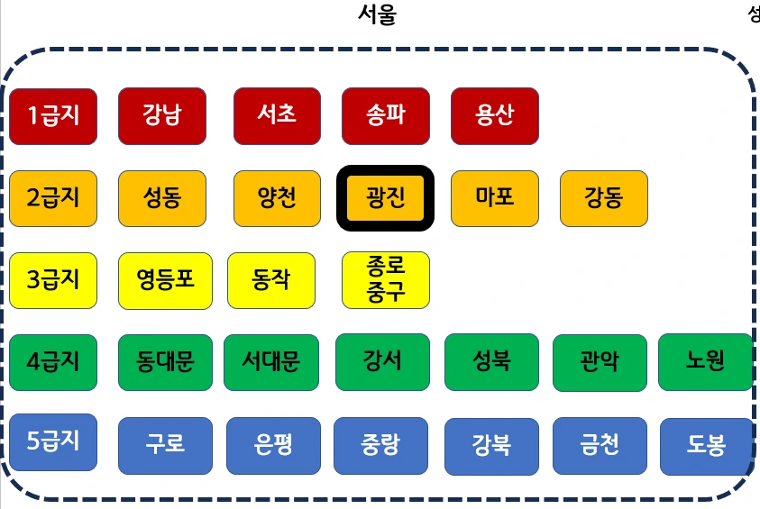 편의상 서울은 5개의 급지로 나누는데요. 25개 구 중 매우 상급지임을 알 수 있습니다.