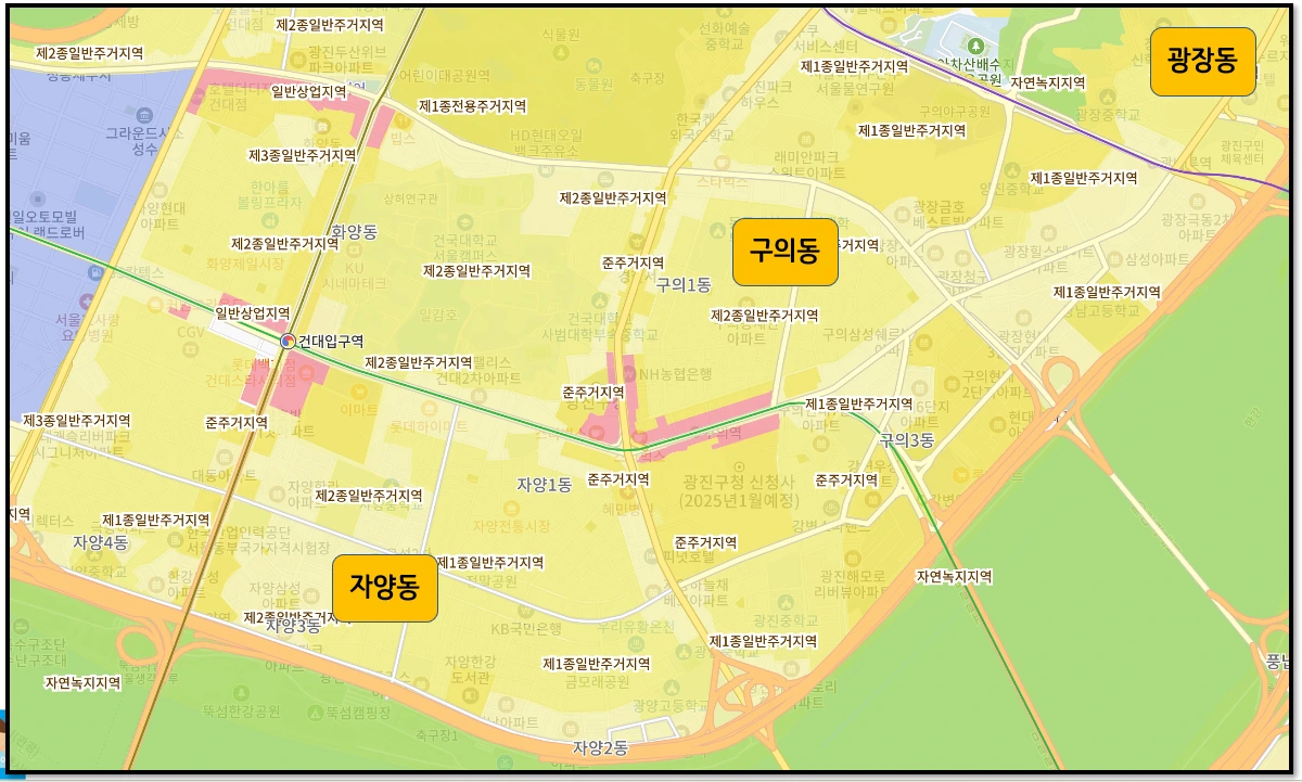 대부분 노란색으로 표기되죠? 주거지역이 대부분입니다. 건대입구와 구의역에 빨간색의 상업지구가 몰려있습니다. 광진구의 아파트 밀집지역은 주거지가 기본이고, 상업지구가 역세권 두 곳에 밀집되어 있음을 지도로 확인가능합니다