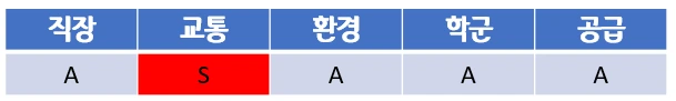 각 입지별로 5점 만점에 직장 4점, 교통 5점, 환경 4점, 학군 4점, 공급 4점 총점 25점 중 21점입니다.