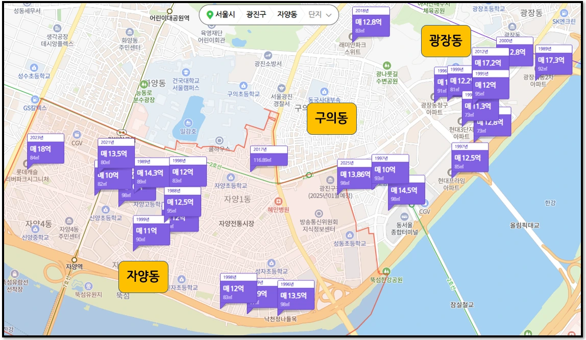여기서 우리가 주목해야 하는 곳은 자양동 구의동 광장동입니다.