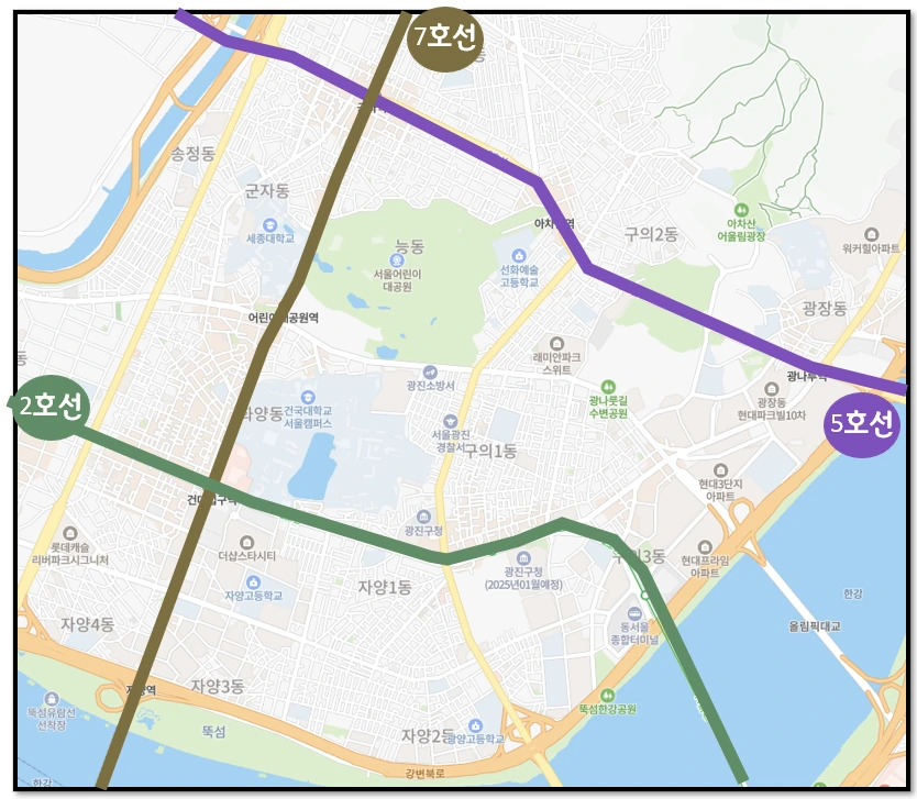 광진구에 깔려있는 호선은 2호선 7호선 5호선입니다.