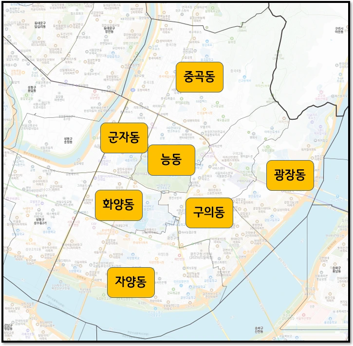 광진구의 법정경계지도를 확인해 보면 총 7개의 법정동으로 나뉩니다.