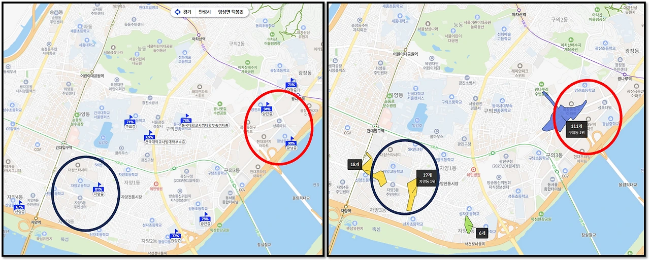 구의동과 바로 옆 자양동입니다. 차이점이 느껴지시나요?