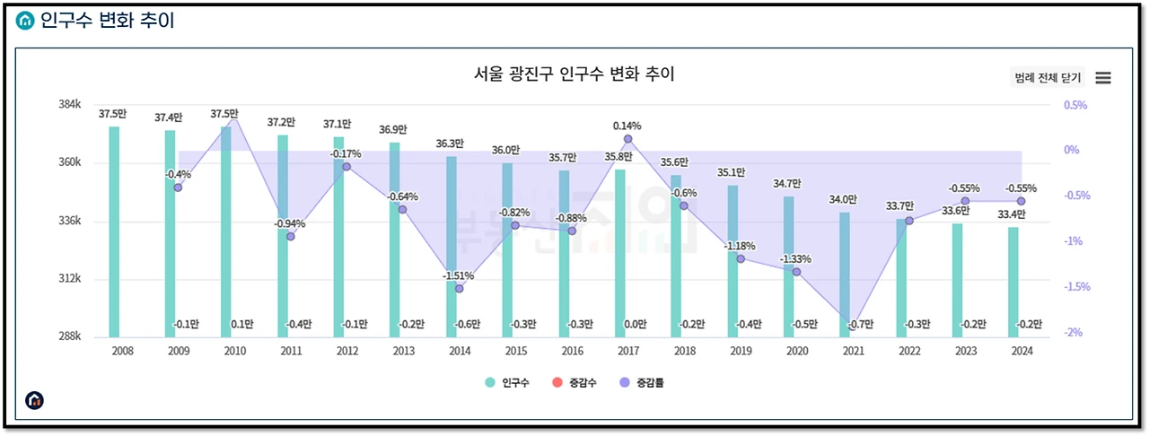 광진구의 인구는 17년을 빼고는 매년 줄어왔습니다. 혹시 인구가 줄고 있어서 수요와 가격하락이 걱정되시나요? 광진구는 거의 준강남인데 인구유출로 가격걱정을 하신다는 건 재벌과 연예인걱정하는 것과 같습니다. 쓸데없는 걱정이죠.