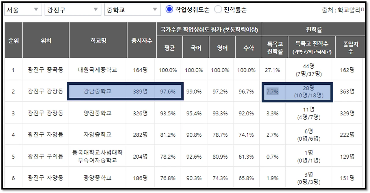 특히 국제고라는 특수중학교도 과학고를 7명을 보냈는데 광남중학교가 10명을 보내네요.