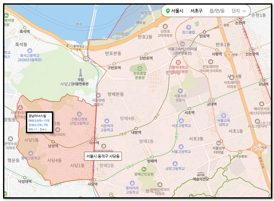 지도를 좀 더 크게 보면, 동작구 사당동은 서초구와 맞닿아 있죠?