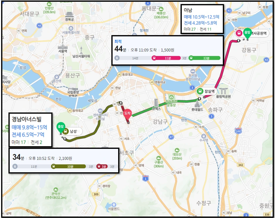 서울 주요 업무지구인 강남권까지의 대중교통 도착시간이 10분 정도 차이 납니다.