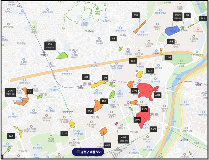 특히 목동쪽에 파란색으로 보이는 학원 밀집지역이 선호됩니다.