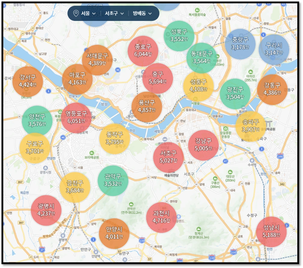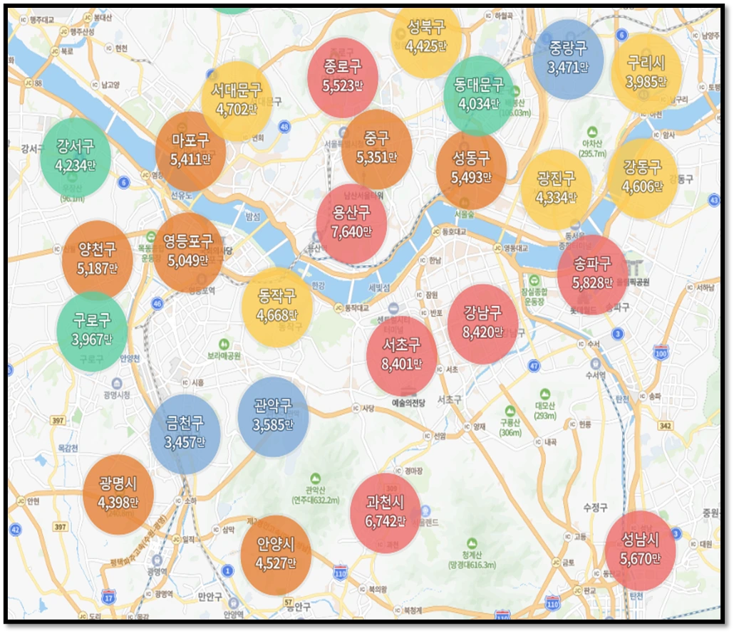 서울 전체적으로 봤을때 아래쪽의 학원가도 굉장히 많은걸로 판단할 수 있습니다.