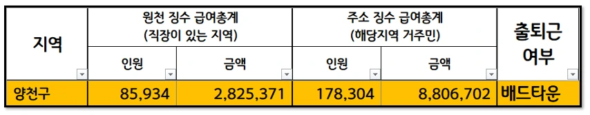 양천구의 원천징수와 주소징수 급여총계를 확인해보면