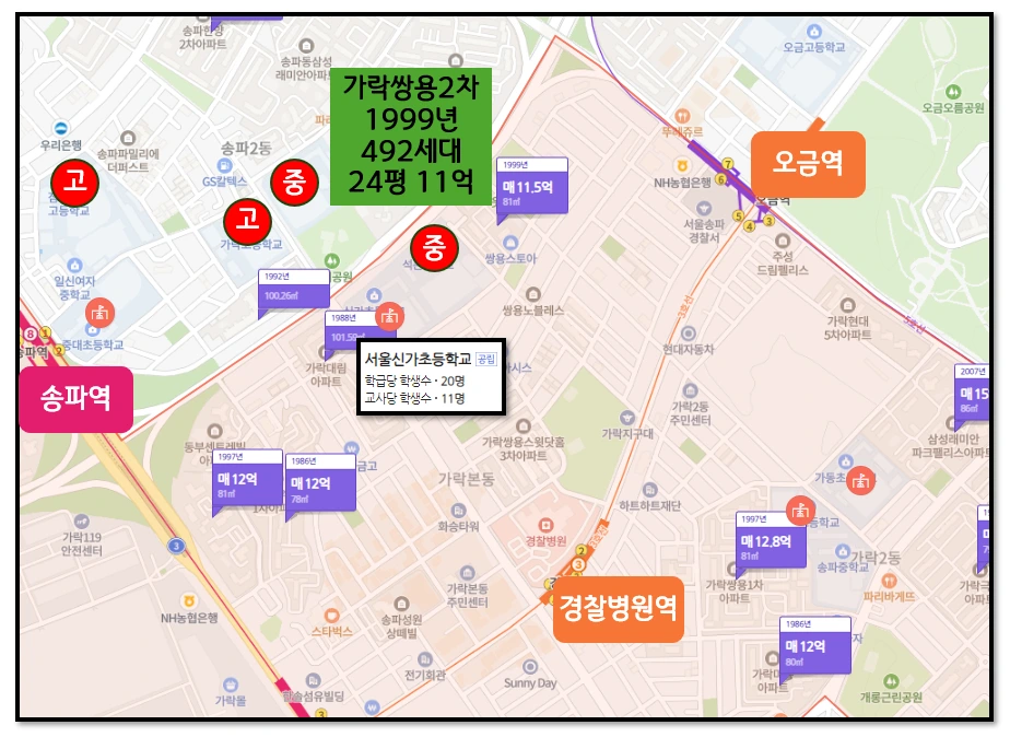 첫 번째로 가락동 가락쌍용 2차 20평대 11억입니다
