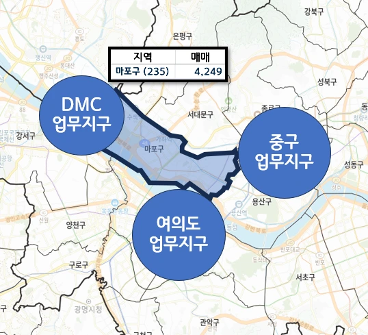 마포구를 중심으로 보면, 주요 업무지구로 둘러싸여 있습니다.